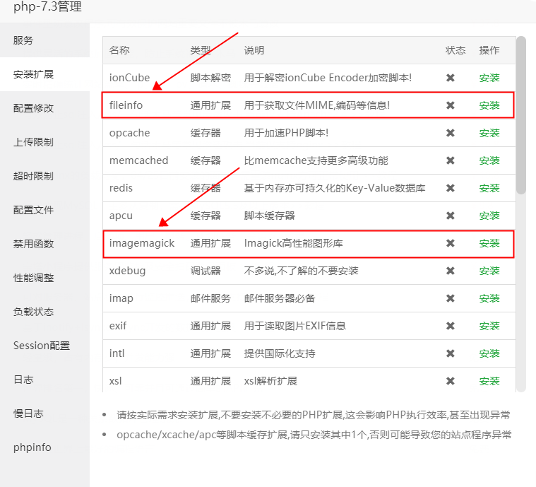 在宝塔后台 - 软件管理 - 找到您站点对应的PHP版本 - 设置PHP - 安装扩展 - 勾选 fileinfo 和 imagemagick