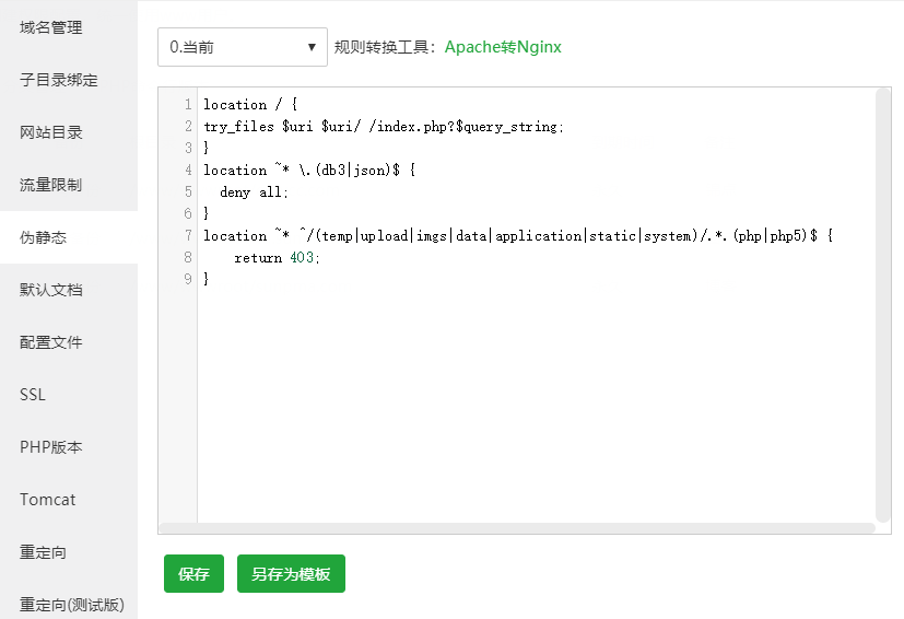 如果您宝塔面板安装的Apache则不需要再设置伪静态,直接跳过这个步骤,如果使用的Nginx环境,请继续往下看。