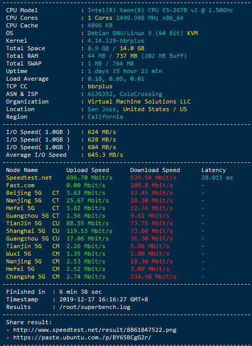 最近入手了很多小鸡,天天跑脚本折腾,特收集了一些常用的脚本,以下测试小鸡是2019黑五virmach闪购的圣何塞7.68刀/年