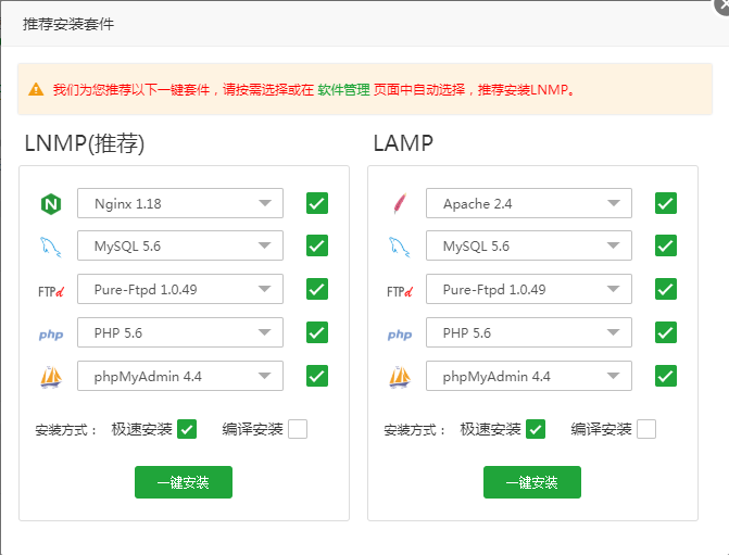 登陆面板时,会引导用户选择安装LampLnmp。建议大家选择安装Lnmp,各程序组件均选择最新版本,勾选极速安装,部署时间视网络带宽和主机配置而定,耐心等待。