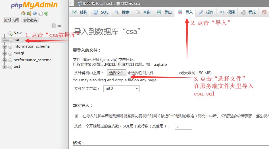 创建后数据库后,面板左侧点击csa,右侧上方点击“导入”,选择本地服务端文件夹内csa.sql文件导入即可