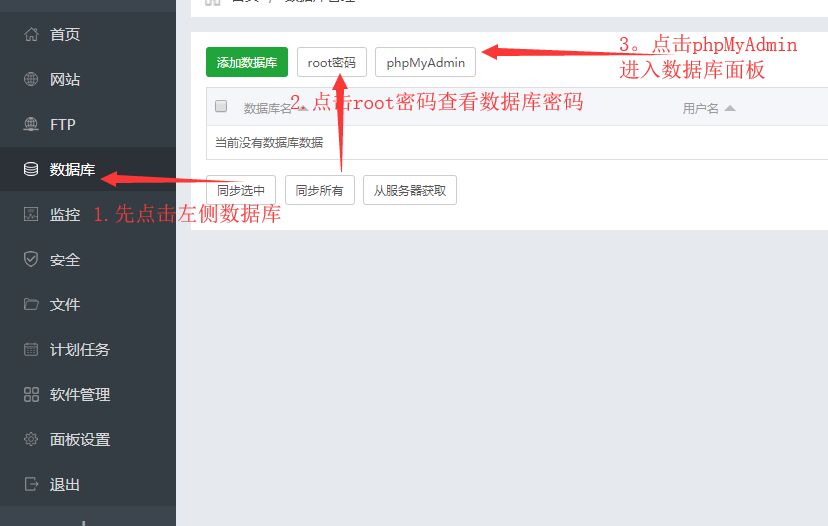 点击面板数据库,查看root密码,最后点击phpMyAdmin进入数据库面板。