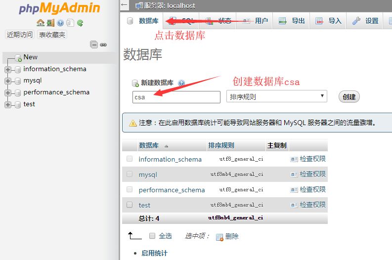 进入phpMyAdmin面板后,点击上方数据库,创建石器数据库csa