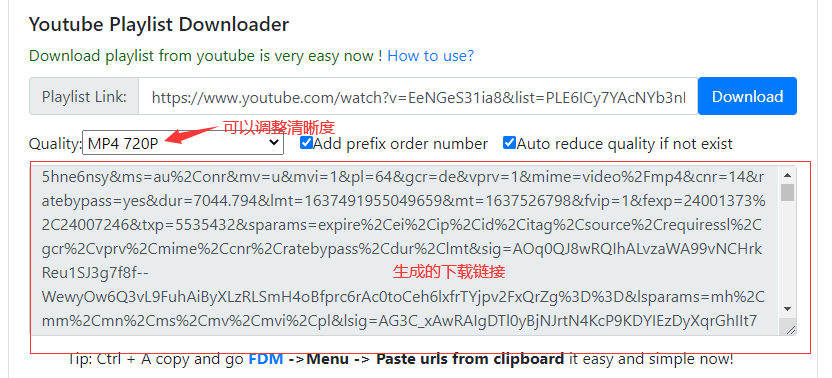 注意一定要把顶部的选项切换到上图所示的Playlist上,否则还是只能获取一个视频的下载地址。