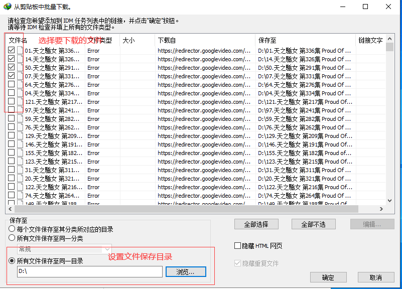 这个界面列出了链接中所有的视频,我们需要勾选出想要下载的条目。设置好文件的保存位置之后,我们点击“确定”按钮。随后IDM会弹出一个新建队列的对话框,如下图:
