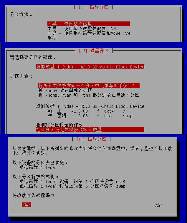 6.硬盘分区,按默认,最后选择是,整个硬盘一个分区