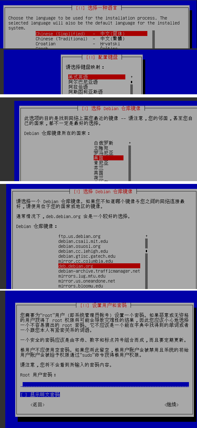 软件包不要勾选桌面,只选 ssh 和标准工具GRUB 选唯一的硬盘,按实际硬盘选