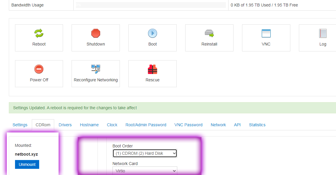 1、进入 KVM控制面板,挂载光盘 netboot.xyz ,启动次序 CDR-ROM优先
