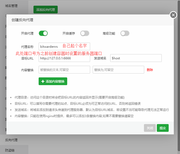 添加反向代理,名称随意填,目标 URL 为 http://127.0.0.1:6666,此处端口号 6666 和上面创建容器时服务器端口保持一致。