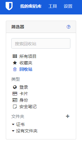 此外,如果回收站内容为空的话浏览器插件我的密码库是不显示回收站那一项的,在服务端更新容器以后也需要登出以后重新登录才能看到回收站(不过也有可能是更新前回收站为空,所以不显示回收站的缘故)。而手机端和桌面端还没有更新,尚不能体验到回收站功能。