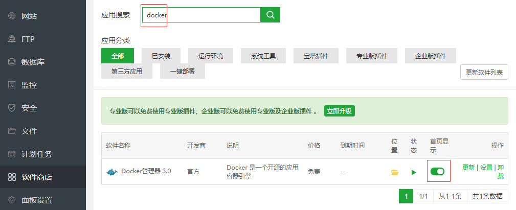 如果宝塔已安装 docker 管理器,该步骤可省略。如果未安装,在宝塔面板首页左侧点击软件商店,搜索 docker,安装即可,安装完后把 首页显示 的开关打开,方便后续管理。