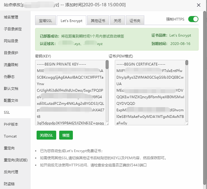 网站设置 SSL,添加证书,强制开启 HTTPS。bitwarden 要求必须使用 HTTPS,这一步不可少。