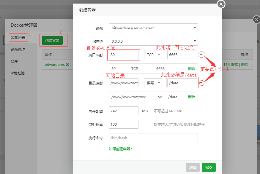 填写目录映射中的服务器目录:/www/wwwroot/xxx(此处目录可自定义,但这里使用网站目录,xxx 为将来打算建立的网站域名,使用网站目录也会给后面建网页入口带来些许方便), 容器目录:/data(必须是 /data)。