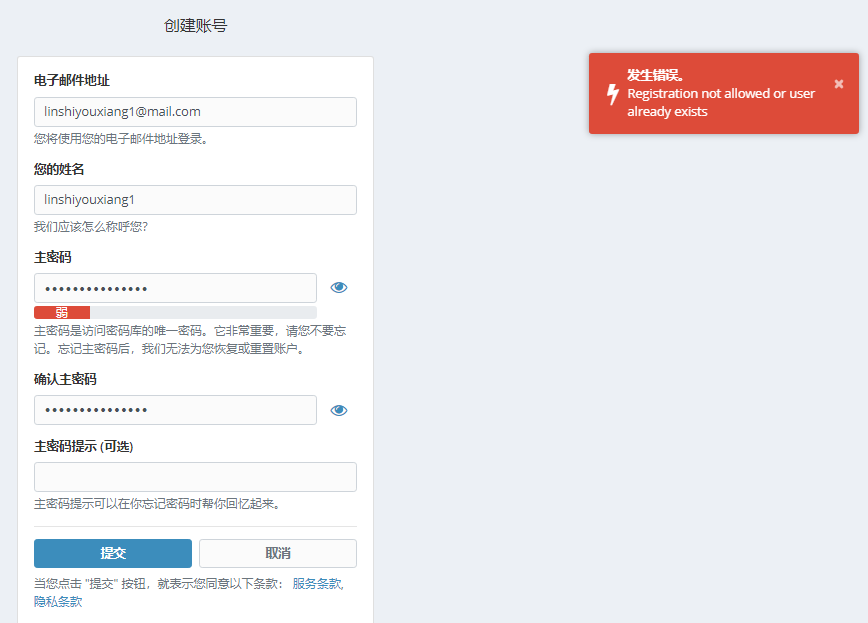 搭建完成后在宝塔安全设置中放行之前设置的服务器端口 6666 和 3012。之后访问网站即可打开 web 页面进行账号注册进行使用了。此处主密码应该设置一个有足够强度且在别处没有使用过自己能记住的密码,以后只要这个密码不失手,那么其他密码就是安全的,以后我们只需要记住这唯一的一个密码。