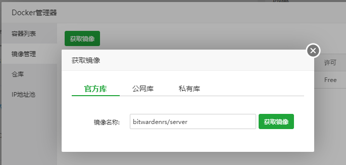 点击镜像管理 ---> 获取镜像,输入 bitwardenrs/server---> 获取镜像 - 创建新容器