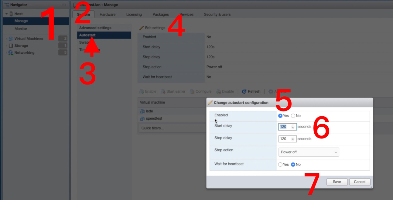没有自启动的高压每次要手动开的话挺麻烦的。我这里说下esxi6.7的做法,在管理里面,系统,第二个就是自动启动。这里有个总体的设置,点编辑设置,已启动,点击是,启动延迟自己调一下我这里选60,点保存。