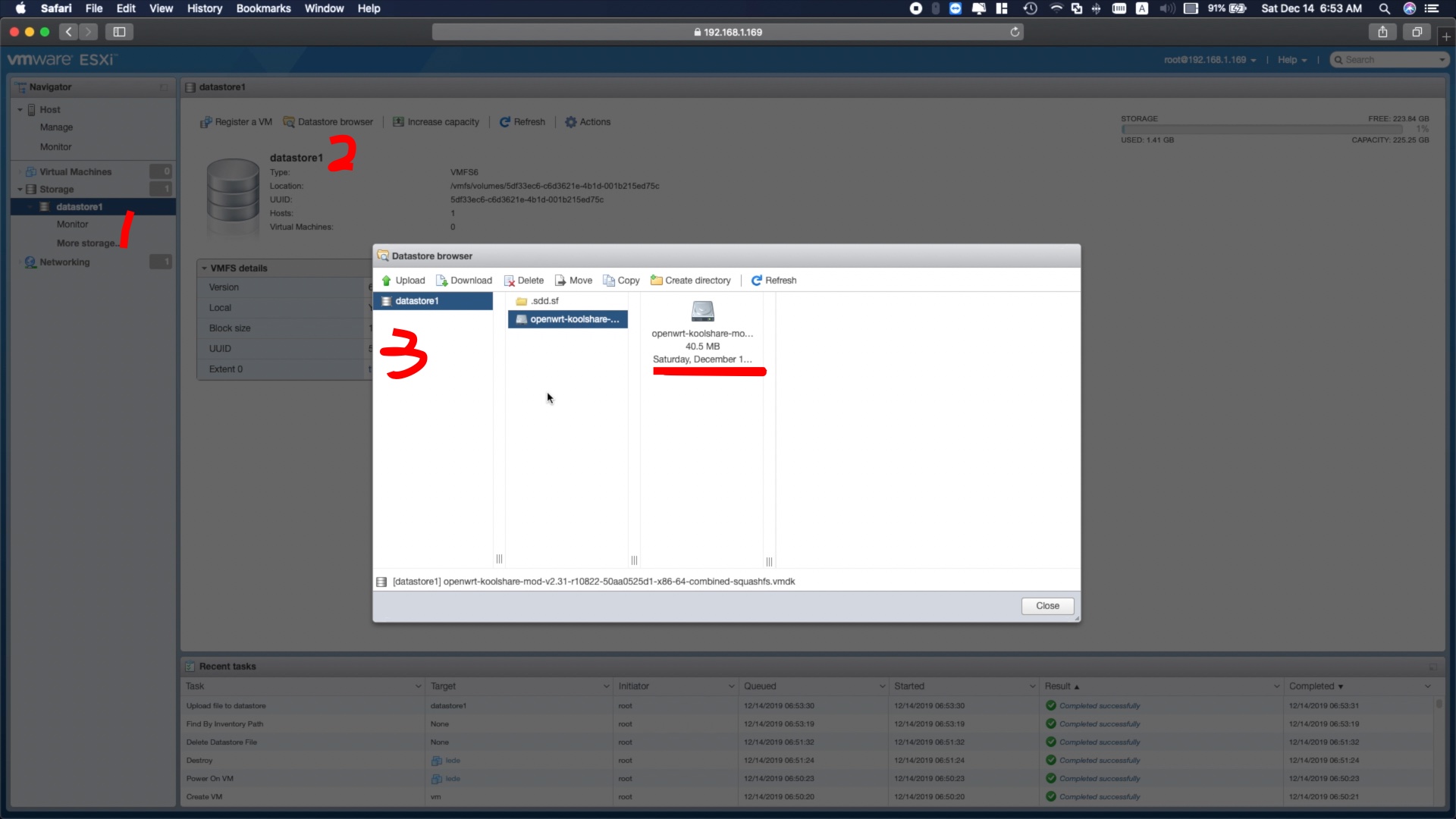 下载完成后,进入esxi的管理界面,点左边导航栏上的存储,再点默认的datastore1,点上面导航栏的 数据存储浏览器 ,点 上载 选择刚下载的文件,可以看到文件的大小只有42.5MB。
