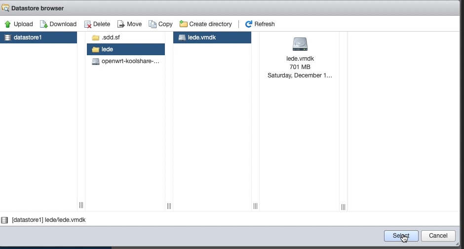 首先是LEDE系统镜像的下载,我个人比较喜欢本论坛的这版,直接去LEDE板块,在最上面的帖子里面有固件的下载地址,貌似是回复可见。在esxi上安装,所以进到虚拟机转盘或PE下写盘专用这个文件夹,里面有4个文件,在两个vmdk结尾的文件里面闭着眼睛选一个。