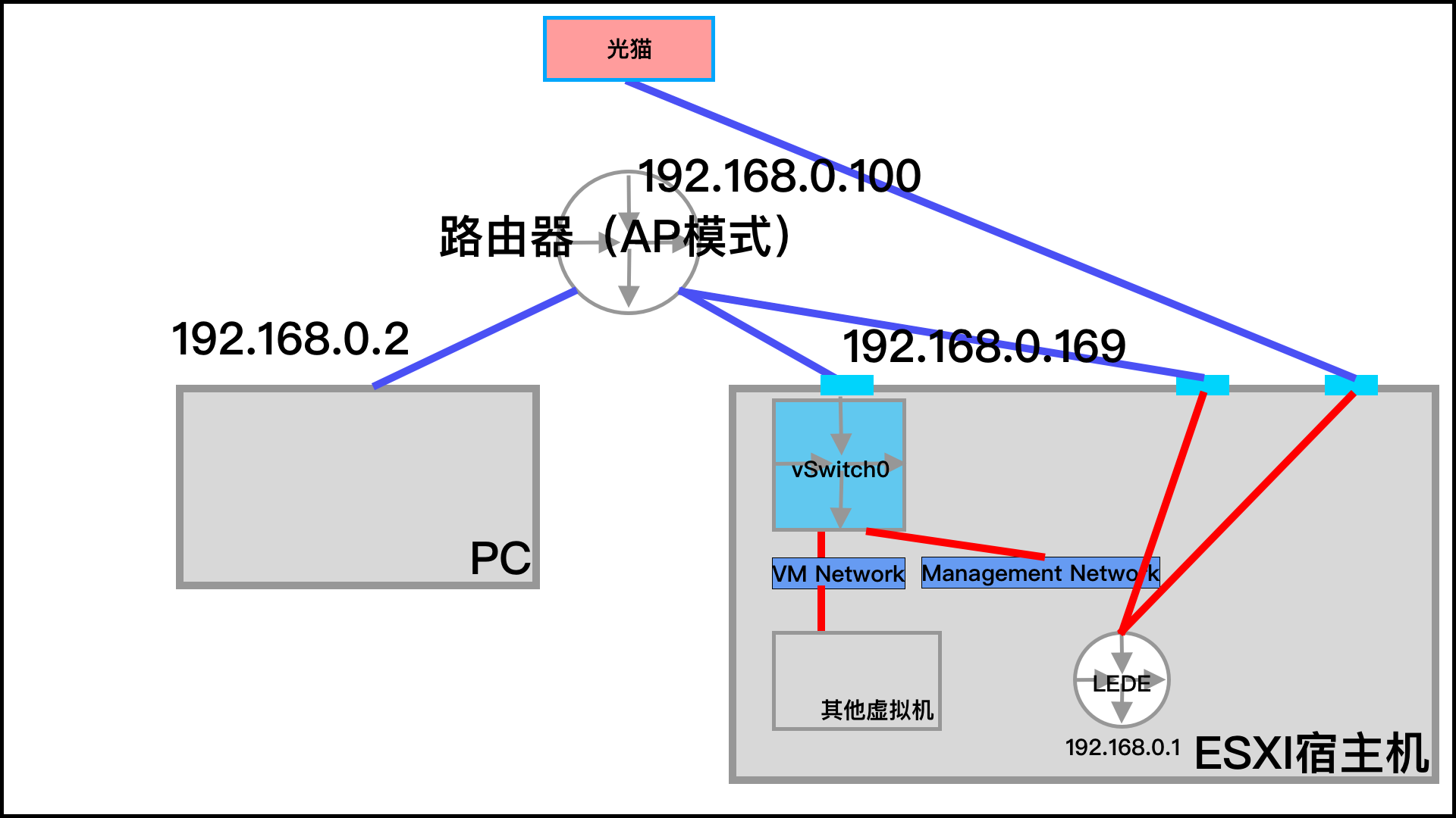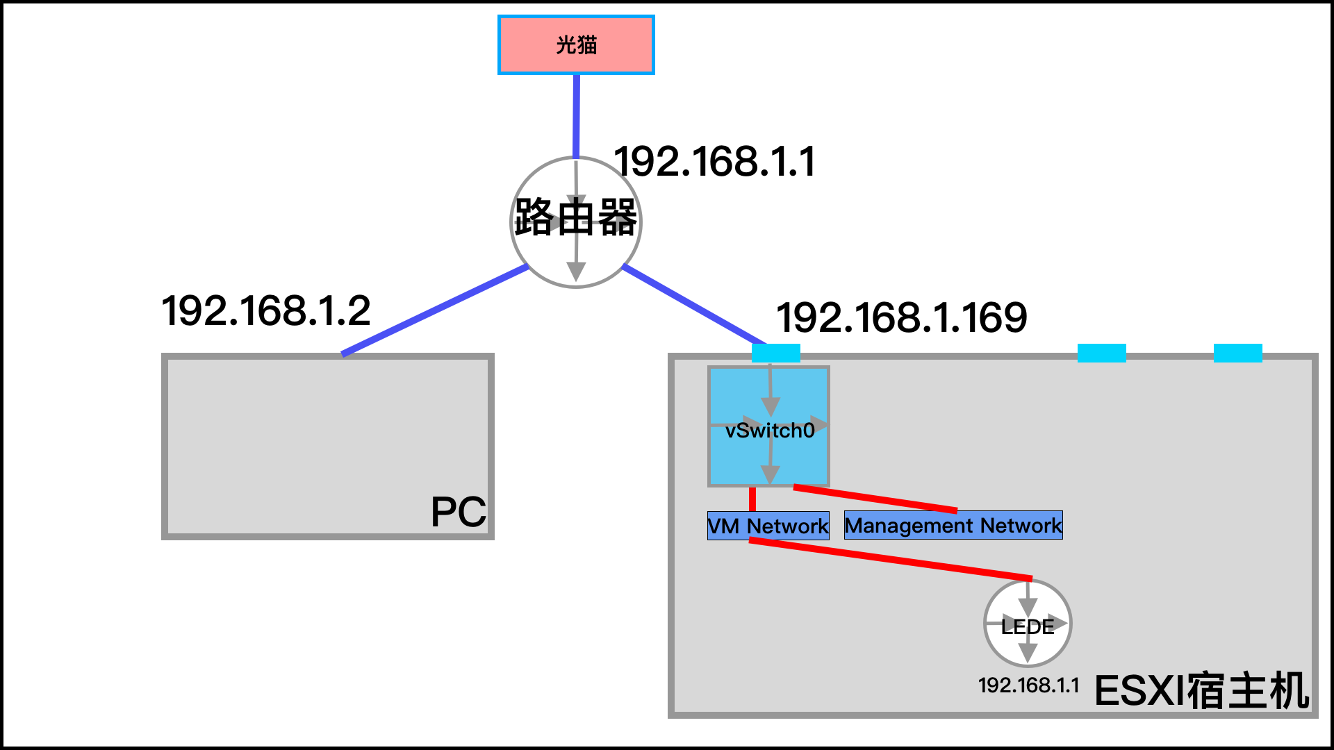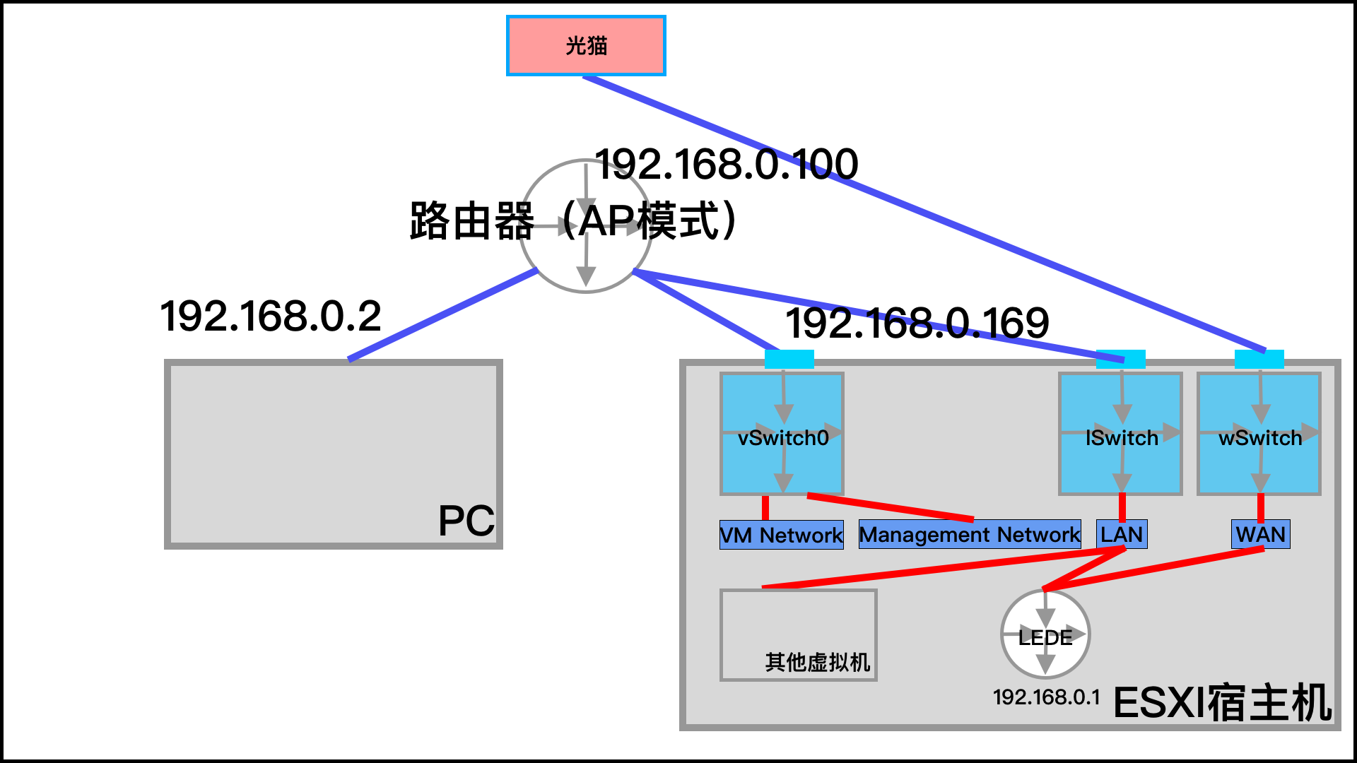 这是我目前在用的直通模式,无论你加不加物理的交换机,这种方式都会比非直通模式配置起来简单的多,需要的网络知识也要少很多,性能也相对较强。链路如下
