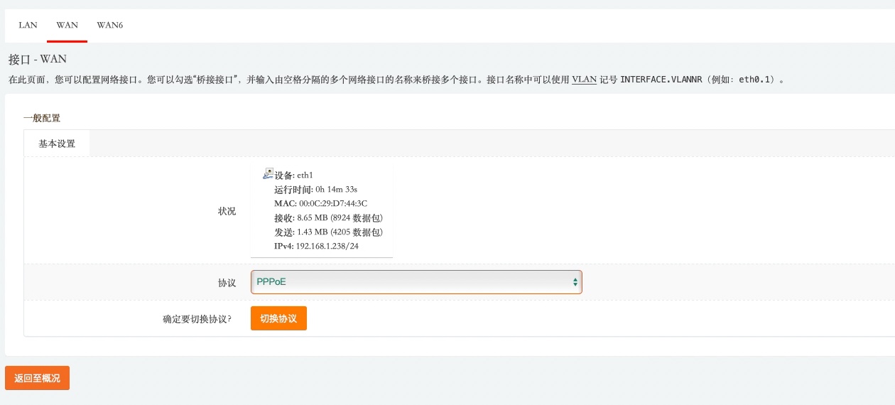 接着我们将电脑连到lede的LAN口上,等电脑被分配了ip地址,浏览器里输入lede的管理地址,koolshare家版本的默认密码就是koolshare,输完密码点登陆。先去配置下WAN口来到接口这里,现在WAN口是自动获取的ip地址,如果要设置成拨号的话,点击 编辑,协议这里选择pppoe,点击切换协议