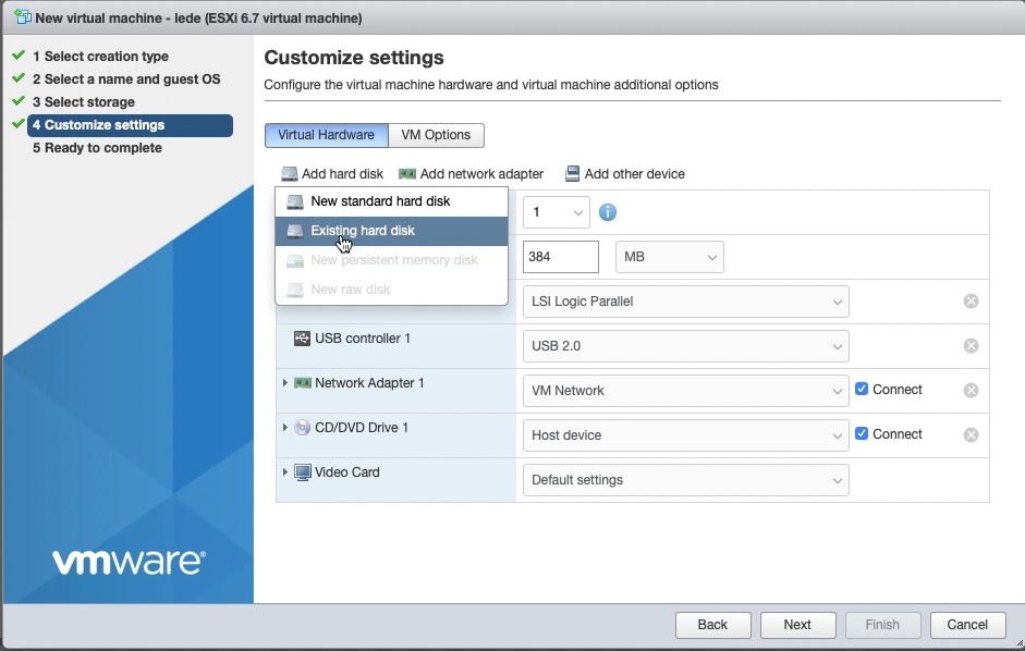 配置虚拟机的性能,我这里都选默认,一般lede不需要多大的内存512MB完全够用,多了也是空在那里,cpu的话,看你的需求适当可以增加。然后我们配置下硬盘,点击硬盘那一行上的叉,把这个硬盘删掉,点击左上角添加硬盘,选择"现有硬盘",找到刚才那个700多M的文件,选中后点确定,点击下一页,点击完成。