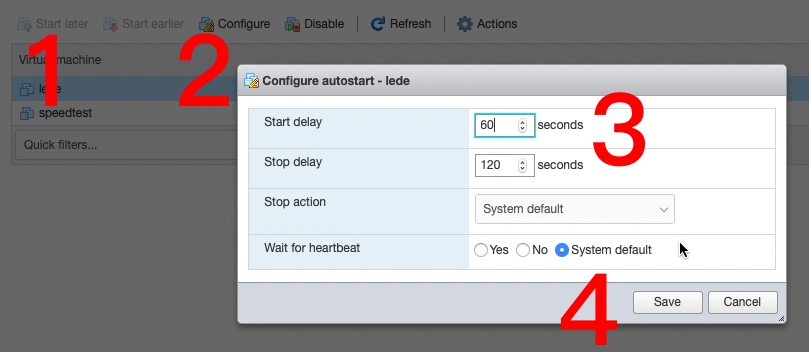 我们开机看一下好了,点lede,点击这个播放按钮或者上面的 打开电源,我们可以看到lede就启动了。至此lede的安装就到这里。